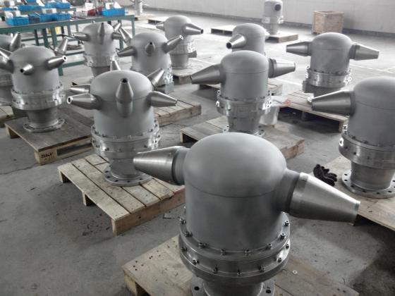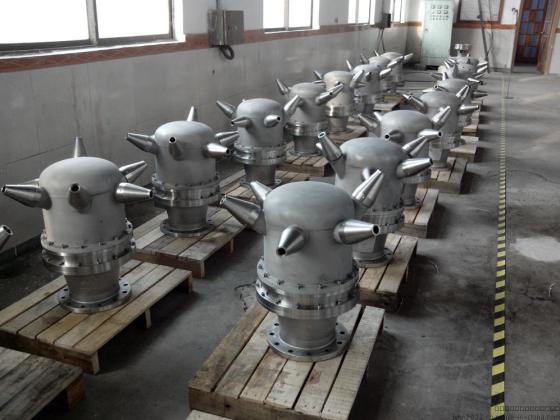 隨位調合旋轉噴頭由噴嘴、集合管、旋轉頭、氣囊、杠桿、法蘭、螺栓等組成,材質為20#、Q235或不銹鋼,旋轉頭為鋁合金或不銹鋼制造。隨位調合旋轉噴頭制造尺寸根據油罐規格、油品種類、調合泵流量等參數進行設計,確定結構長度、角度。