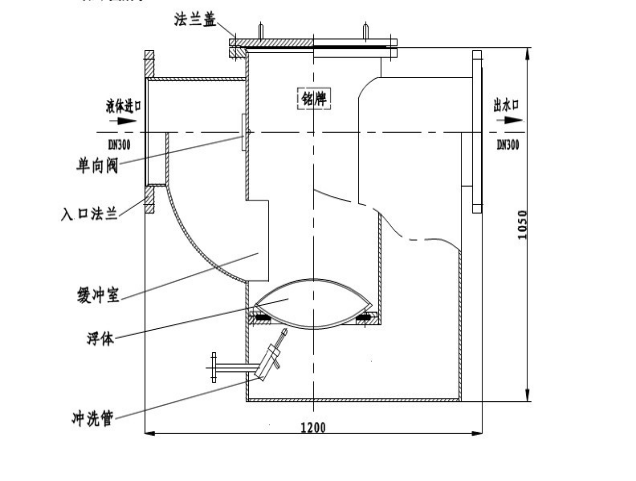 3、 當管道內油水混合時,進水通道、緩沖室與出水通道組成了水封,水從緩沖室下排出,而油從緩沖室上部回流。