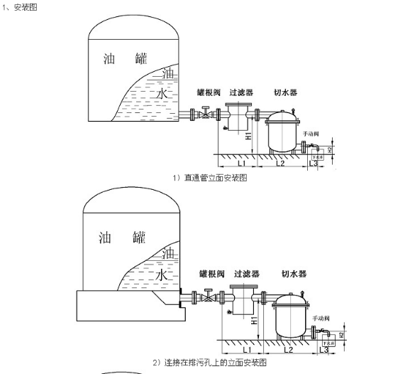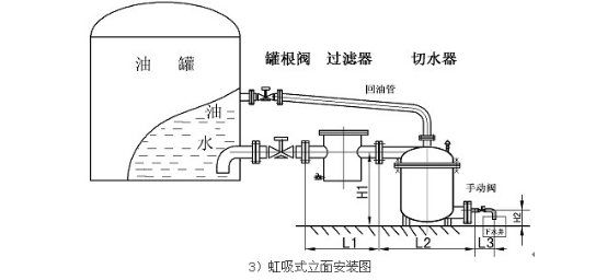 1、 本產品要求安裝在平穩、堅固的地基上。進水口應平于或略低于油罐排水口。安裝方式分兩種:①不帶虹吸管的油罐安裝(參見圖一、圖二)。②帶虹吸管的油罐安裝(參見圖三)